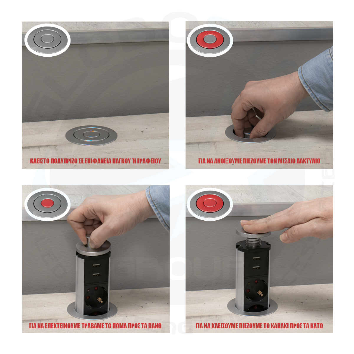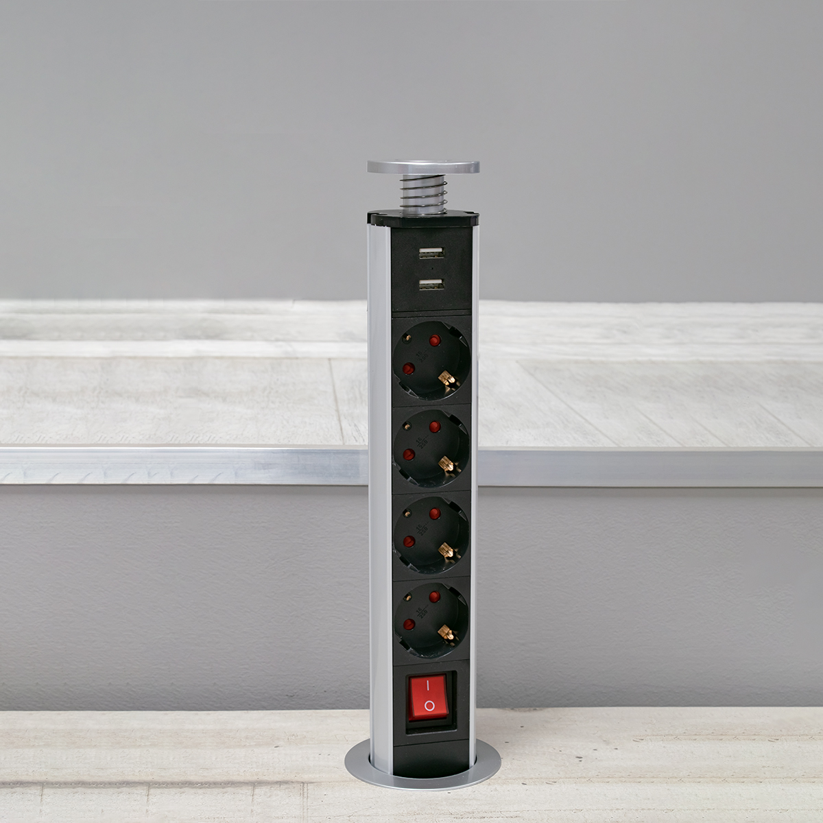 GloboStar® 79631 Χωνευτό Πτυσσόμενο Πολύμπριζο με 4 Πρίζες Ασφαλείας EU Σούκο AC 230V Max 4000W & 2 Εξόδους USB DC 5V Max 3A 18W & Ενσωματωμένο Διακόπτη Οn/Off